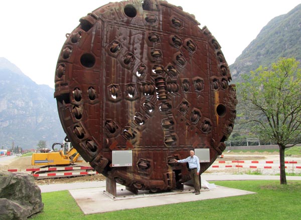 Dr. Palaschewski vor der Schneidplatte der Schildvortriebmaschine zum Bau des Gotthardtunnels.