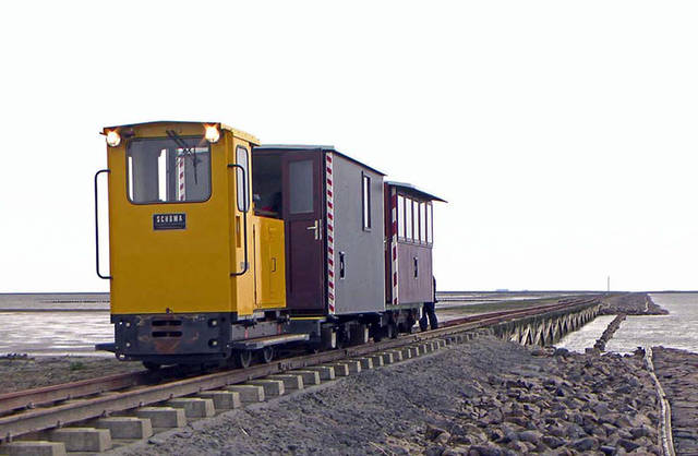 Personenzug auf der Halligbahn Dagebüll–Oland–Langeneß. Foto: Heino Vogel